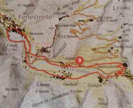 È una passeggiata facile, adatta a escursionisti di tutte le età. A Fenestrelle si attraversa il Chisone in località Spiaggetta e si scende verso valle. Si supera la ridotta Carlo Alberto, la centrale idroelettrica e il vivaio regionale Carlo Alberto, raggiungendo la frazione Chambons. Si continua verso valle e si raggiunge la borgata Granges, da cui in breve si arriva a Mentoulles dopo aver nuovamente attraversato il Chisone e in seguito la SR 23. Si prosegue salendo verso Ville Cloze.