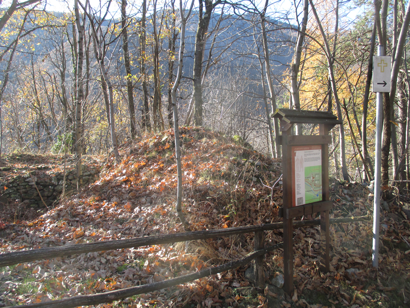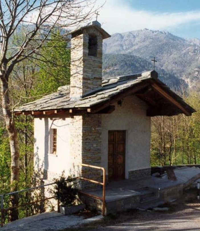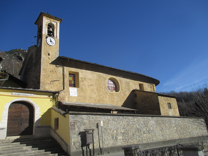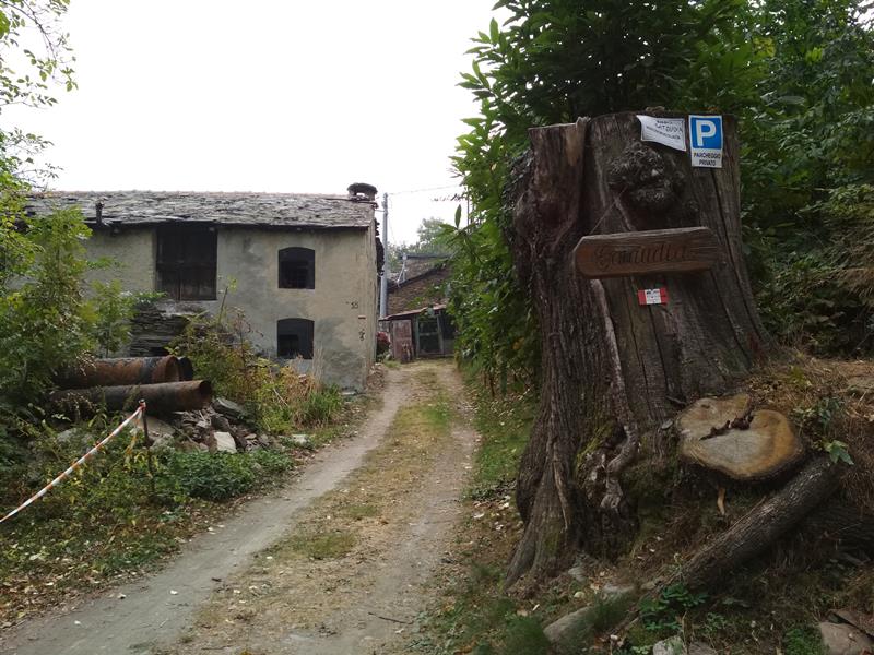 Attraversata piazza III Alpini e la SR 23, subito si incontra il monumento al Dahu [B1], scolpito nel legno di un antico cedro del Libano, pianta secolare di proprietà privata che purtroppo si è dovuta abbattere nel 2019. La scultura rappresenta il Dahu, che dall’alto troneggia sugli gnomi delle miniere, con riferimento alla leggenda che li voleva impegnati nell’estrazione dell’argento dalle gallerie scavate nel Monte Bocciarda.