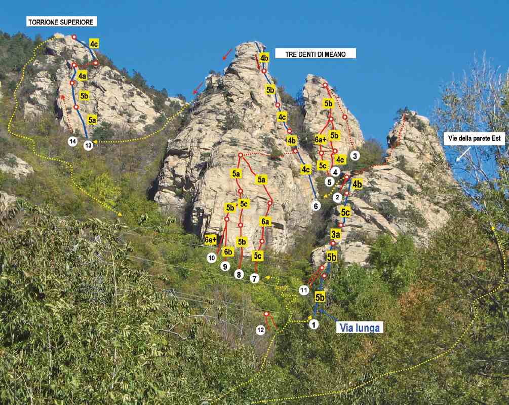 Nel 2010 è stato attrezzato anche il torrione che si trova a monte dei Tre Denti. Lo si può concatenare con il Dente Orientale e Occidentale, ottenendo così una via di 14 tiri con difficoltà medie di 5° grado. 1) Via lunga 2) Millenium bug 3) via degli amici 4) via Michelin - De Poli 5) variante diretta 6) via Michelin – Battù 7) via del diedro 8) via delle placche 9) via dello spigolo 10) via della fessura 11) settore monotiri 12) settore monotiri 13) via delle placche rosse 14) spigolo di sinistra