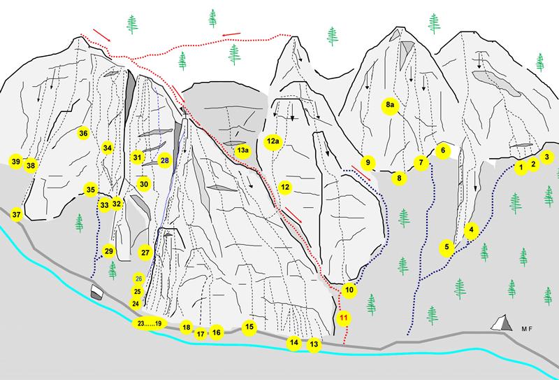 Tutti i siti, con le rispettive vie e monotiri, sono recensiti all'interno della guida locale "Arrampicare nelle Terre del Dahu" - LAREditore, sono inoltre disponibili numerose recensioni online.